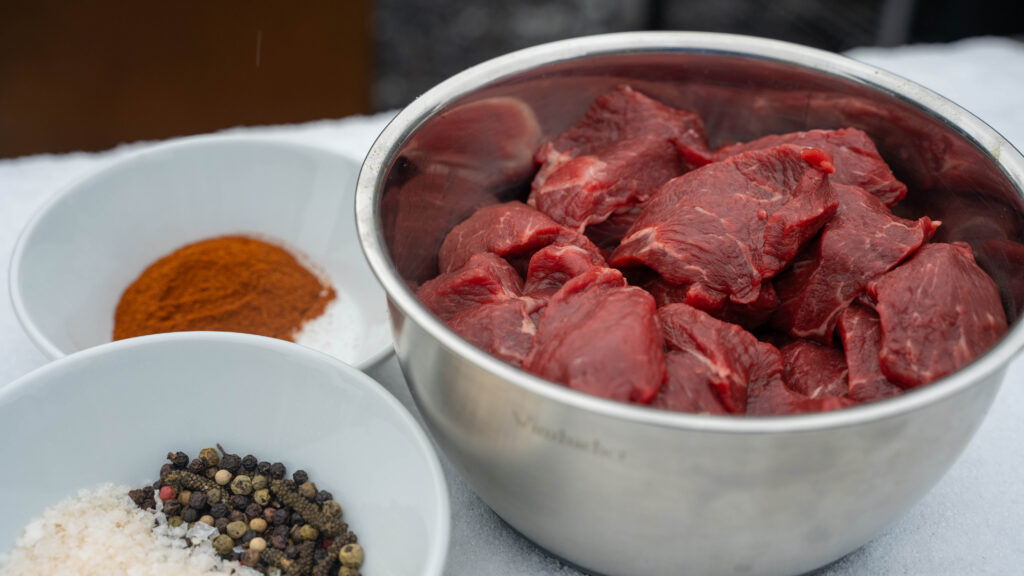 Für ein gelungenes Dutch Oven Gulasch vom Grill ist die Wahl des Fleisches entscheidend. Verwendet wurde Boeuf Bourguignon, also Rinderschulter. Dieser Cut enthält einen hohen Anteil an Bindegewebe und Kollagen, was ihn ideal für lange Schmorprozesse macht.