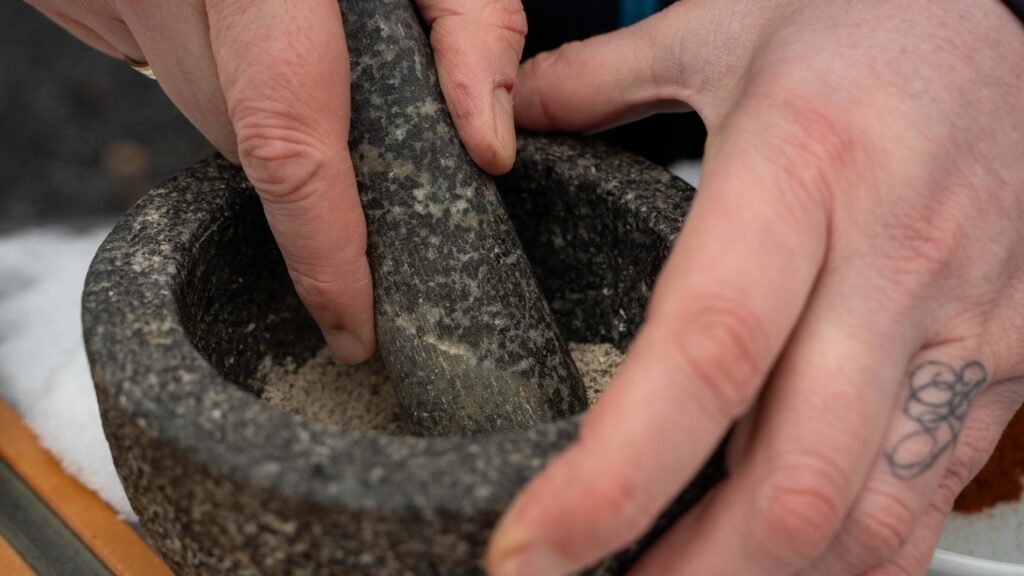 Durch das Anstoßen bleiben ätherische Öle erhalten. Der Pfeffer wirkt warm und aromatisch statt scharf, das geräucherte Paprikapulver bringt Tiefe, ohne den Eigengeschmack von Fleisch und Zwiebeln zu überdecken.