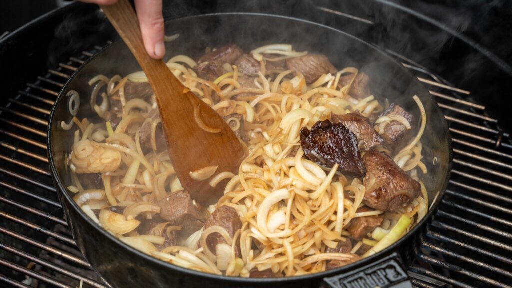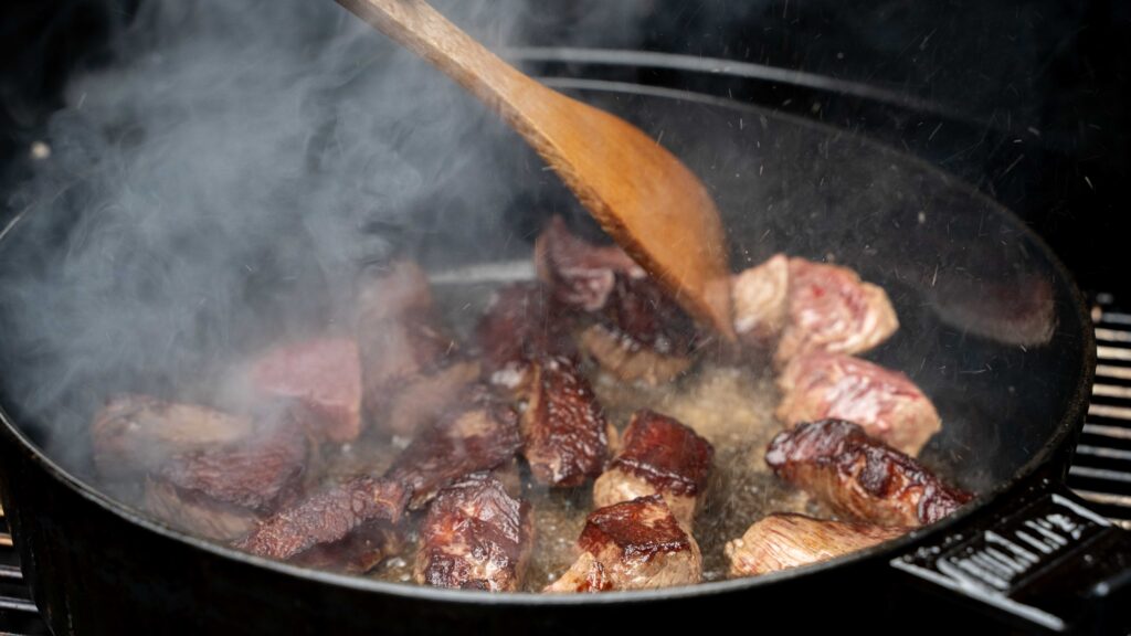 Diese Anfangshitze ist notwendig, um kräftige Röstaromen zu erzeugen – eine Grundvoraussetzung für ein geschmacklich tiefes Dutch Oven Gulasch vom Grill.