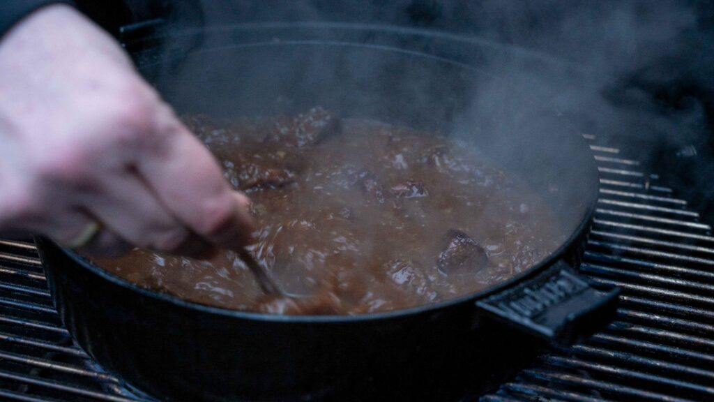 Während der etwa zweistündigen Garzeit wandelt sich das Kollagen langsam in Gelatine um. Genau dieser Prozess sorgt dafür, dass das Fleisch saftig bleibt und die Soße des Dutch Oven Gulasch vom Grill später ihre natürliche Bindung erhält.