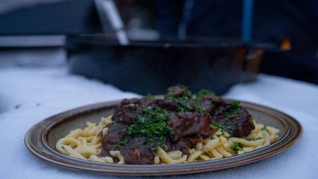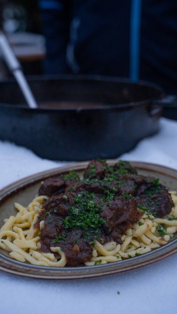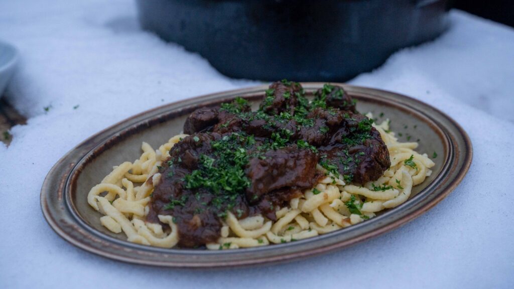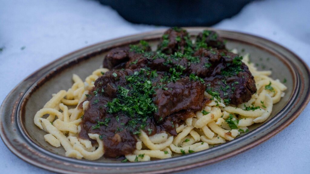 Klassisch serviert wird das Dutch Oven Gulasch vom Grill mit Spätzle. Die Soße haftet ideal an der Oberfläche. Frisch gehackte Petersilie sorgt zum Abschluss für Frische und Ausgleich.