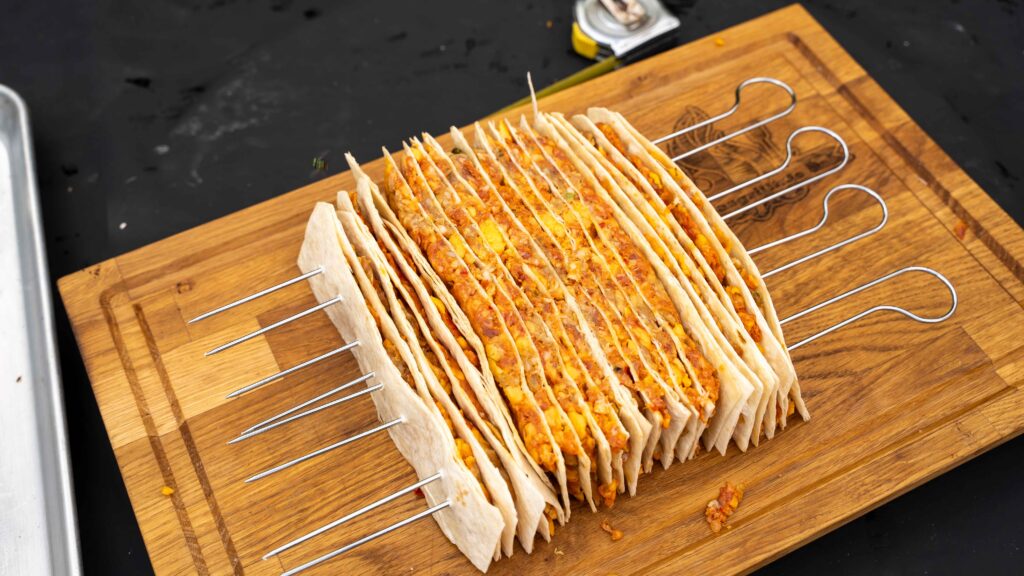 Diese Technik sorgt dafür, dass der Knusprige Hack-Wrap-Spieß vom Grill stabil bleibt und sich gleichmäßig grillen lässt.