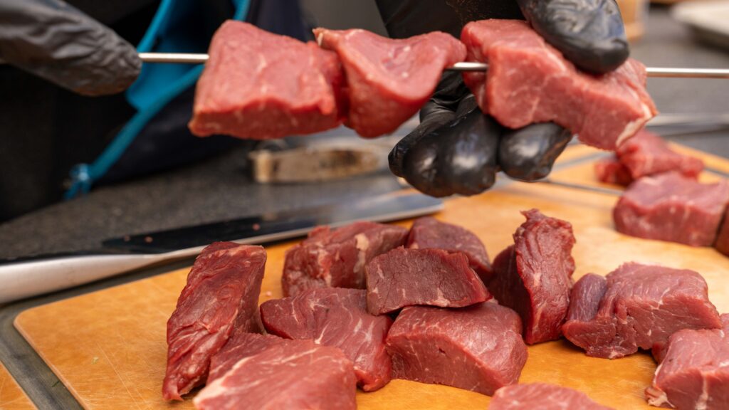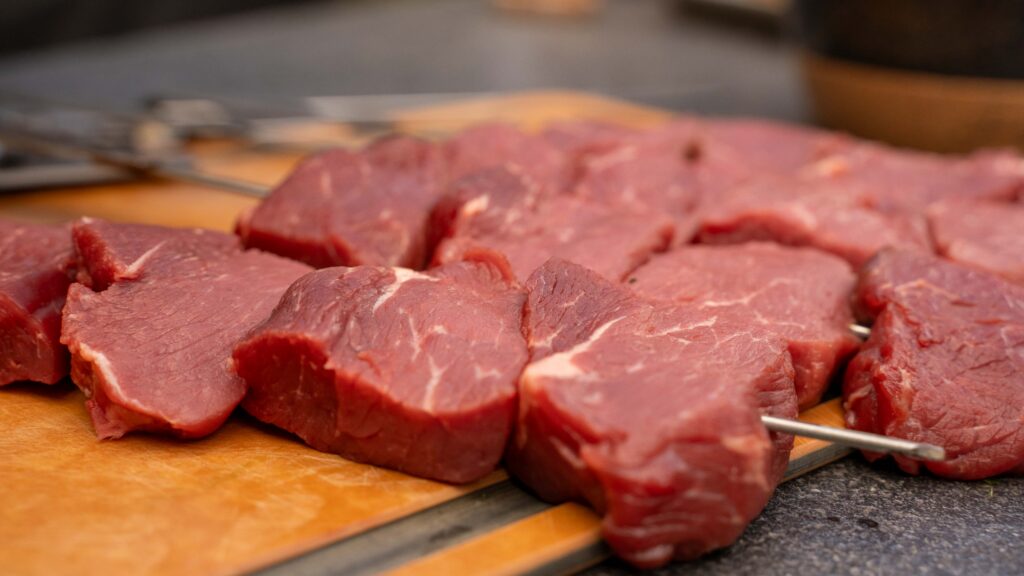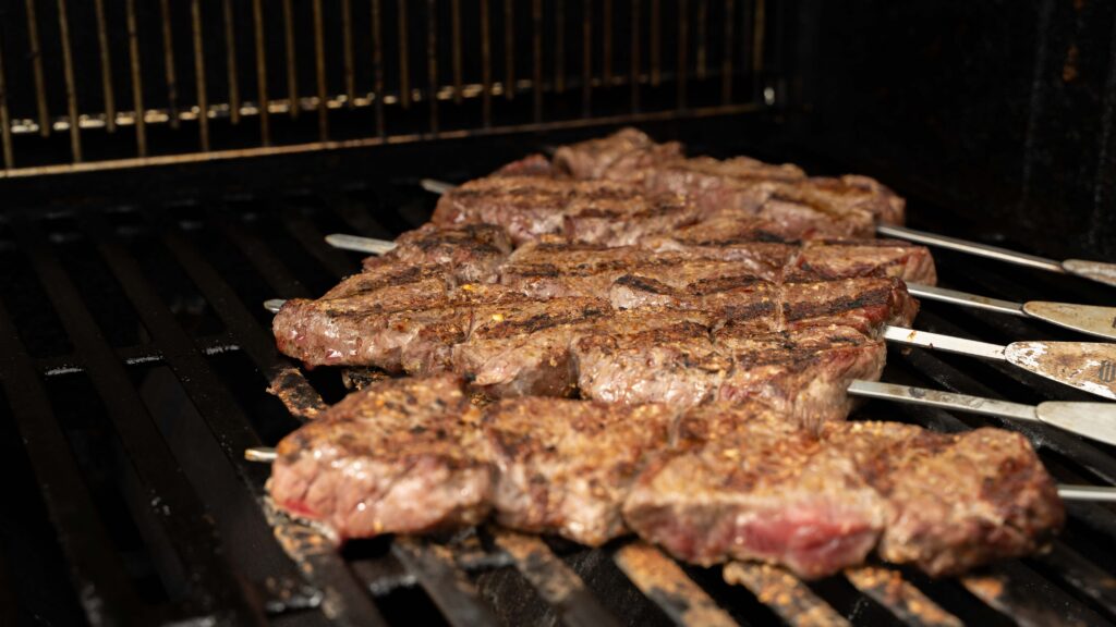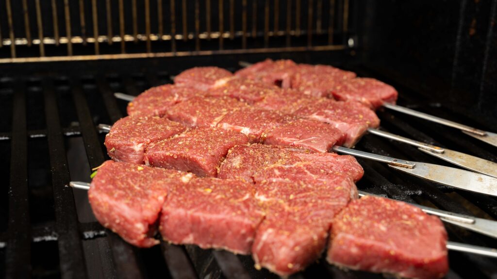 Die Fleischstücke werden auf stabile Metallspieße gesteckt – idealerweise mit etwas Abstand, damit die Hitze optimal zirkulieren kann.