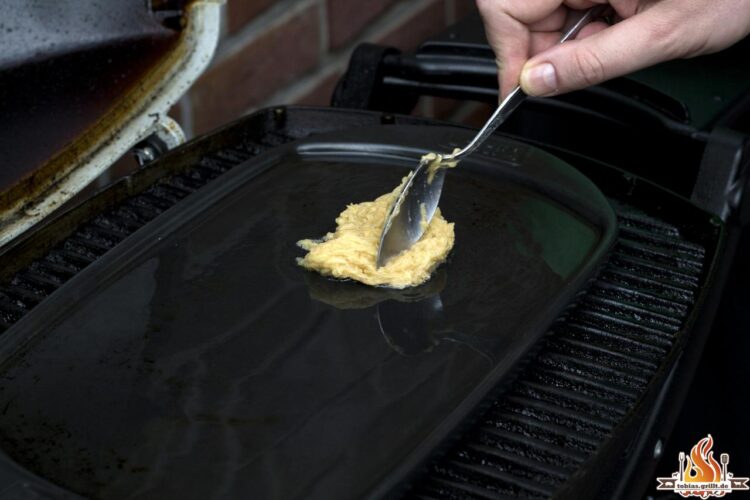 Die Kartoffeln fein raspeln und mit 3 TL von meinem Allrounder Rub würzen, ein Ei nebst 2 EL Paniermehl vermengen und als Puffer in einer Pfanne auf dem Grill zubereiten.