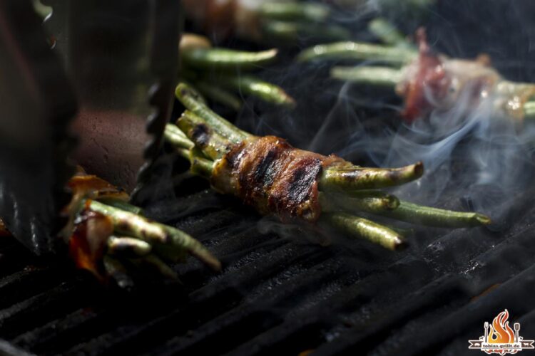 Für die Bohnen eine gute Handvoll mit Bacon umwickeln und bis zur gewünschten Färbung grillen und im indirekten Grillbereich etwas ziehen lassen.